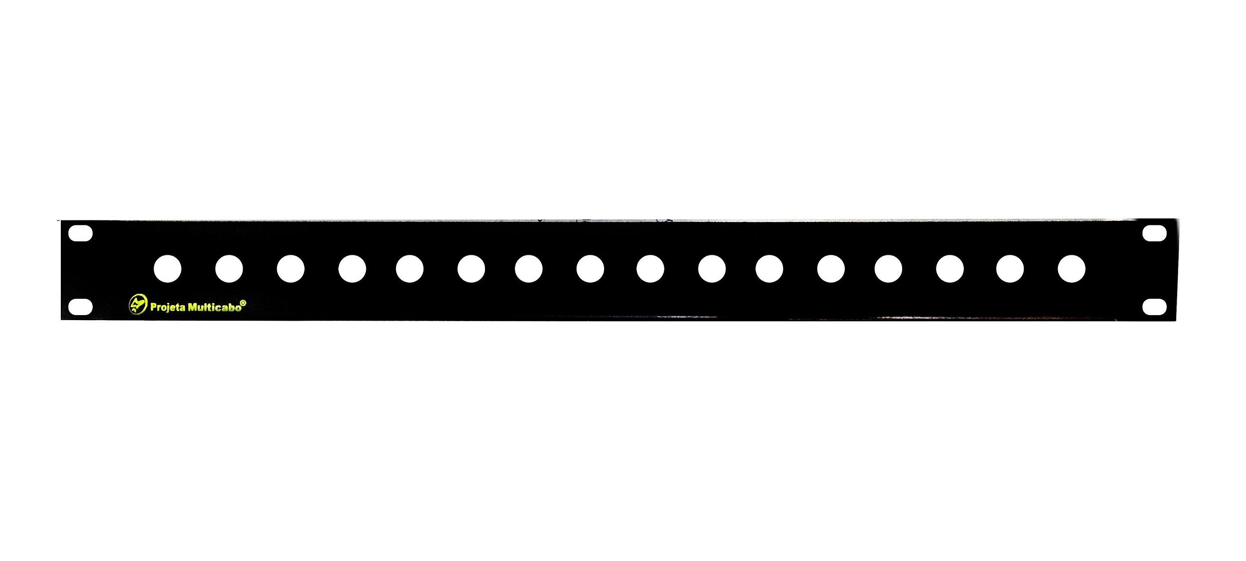 Régua metálica de alta resistência com 16 furos para jacks. Esta régua, uma vez fixada a um rack, case ou estação, possibilita ligação ou extensão para vários equipamentos.